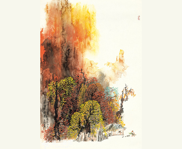 叶瑞琨十分喜欢巴山蜀水的自然环境,他说四川是个好地方,四川的山水既有北方的雄奇又有南方的幽深,但又不是江南那种斜风细雨的幽深,巴蜀的山水自有一种独特的深邃感和神秘意境。而在四川他又尤其喜欢米亚罗,米亚罗色彩绚丽,体现在他的画上也是色彩鲜艳层次分明。巴山蜀水给了叶瑞琨无限的创作激情,那种神秘感使他的画少皴擦多沁润,绚丽的色彩让他的画从墨的五彩跳脱到色的韵味。他一年里总有一半的时间行在路上,他说写生其实就是在自然中去发现与自己的心灵相契合的东西,再把这些东西转换为自己的绘画语言。