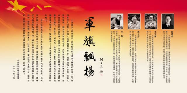 七月流火,赤日炎炎。在这红色的七月里,继党的生日之后,全国军民又迎来了中国人民解放军建军90周年的伟大节日。没有人民的军队,就没有共和国的今天。为弘扬我党我军的优良传统、振奋全国军民的爱国热情,激发深入改革的时代精神,书画频道特别邀请张道兴、李宝林、刘大为、李翔四位著名的军旅艺术家在书画频道美术馆举办“军旗飘扬——庆祝建军90周年军旅画家主题创作展”。
