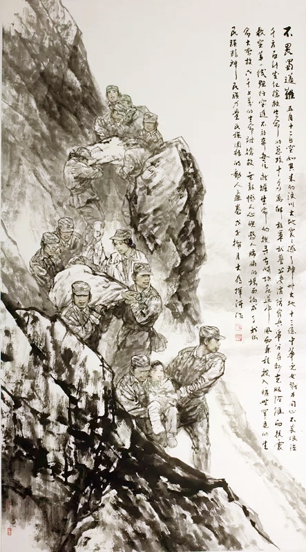 这四位德高望众的艺术大家以饱满的激情向伟大祖国、伟大军队献上主题性创作作品60余幅。浓墨重彩描绘英雄人物,磅礴正气再现恢弘场景。每一幅作品都定格在革命历史重大事件或英雄群体,铮铮铁骨,赤胆忠心,壮我军威,激励我们不忘初心,继续前行。