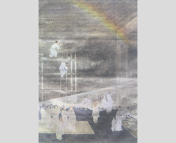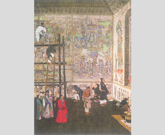 潘先生在建国初期完成的这一作品,站在今天的高度重新审视它时,人们不难发现,就其整体效果看,仍然是十分辉煌动人、成熟和完美的,它以历史再现的手法,表现一千两百年前盛唐时期,虔诚的上层社会佛教信徒、勤劳智慧的劳动者和技艺卓绝的民间画师共同开发西北边陲,开创敦煌艺术的情景。画面突出重现千余年莫高窟全盛时代那种富丽堂皇、十分壮观的场面和时代气息、,确乎有扑人眉宇的力量,面对那经历千年时间考验后的洞窟绘画,至今仍不减摄人心魄的力量,谁能不去想象出当年景象该是如何的壮观?也许正是这种愿望,也促使潘先生运用现代主义和浪漫主义的方法,凭借在敦煌所得亲身感受,加上丰富的想象,终于创出此出众之作。就当时创作此画的中心思想,作者要突出表达的是穷苦而有才华的画师们的辛勤劳动和锦衣玉食的达官贵妇不劳而获的对比。尽管在任务的描绘上不能不受到资料不足的限制,但从作品的整体上看,是表现出了盛唐时代气息的,由于作者重现的背景之壮观,使这件作品具有跨时代的审美力量,不仅在50年代,就是1983年在巴黎春季沙龙获得金奖,也绝不是偶然。