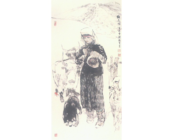 从本届展览二等奖两幅水墨写意作品《节日》和《高原兵花儿》,及三等奖《高原风》来看,作者亦都在尝试多种技法。《节日》灵动的笔墨与别致的结构,《高原兵花儿》独到的处理迷彩服的皴染,《高原风》粗犷劲健的渴笔造型等,都各具特色。但离大写意水墨人物的完美来说还有相当距离。如《高原兵花儿》“脸部的刻画。虽然这些面孔都很真实,……有点过于自然,有些形象可能更多地参照了照片”。或者说,还不算真正意义上的水墨写意作品。