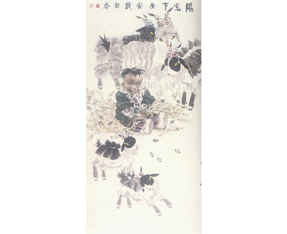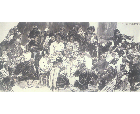 水墨写意人物中也有一些好作品。如《轻骑皓月牧歌》,淡墨为主,用笔轻松自然。有的偏墨如《暖阳》,有的偏笔如《净土》、《春暖》,《高原一家人》则笔墨皆轻松。有人尝试以淡墨线块造型如《累了》,亦各具特色。有的画家或许明白水墨写意人物根本就不便造型,反而就玩笔墨,或抽象,或简笔,造型生动活泼,笔墨灵动潇洒,惹得喜欢笔墨的评委欲罢不能,纷纷入选。此类作品有四、五幅之多。更有人干脆集多张小品裱成一幅,在展场上不仅新颖,效果也不错。这可算最聪明的了。但这类作品取巧因素多,实力表现不够。另一些老老实实劳心费神画水墨人物画的参展作者其作品尽管也各有所长,但或囿于生活只画出事件,或因写实之需而受制于照片,或笔墨粗糙画不耐看,或把控场面结构能力差,如此等等,水墨写意人物作品好的真的就不多了。这种情况与几乎所有的全国性展览的现状是一致的。如从几乎全为水墨写意的“特邀作品”来看,这些作者皆功成名就,故其作品大多风格成熟,笔墨老练,但其中能完成复杂造型大型结构且风格完美者仍不太多。当然这也与其个人的兴趣选择有关,无可厚非。但就人物画创作总体格局而言,一个国家总得有相当比例的画家关心国家、关心社会、关心历史、关心重大主题,对一个一直被视为主流状态的水墨写意人物画类型,要求更当如此。