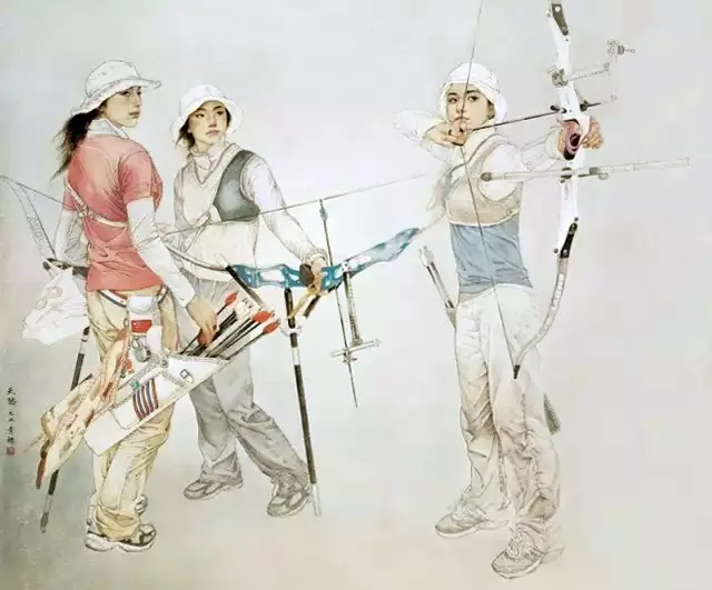 一个偶然的机会我跟随四川射箭队去广西,参加了一场全国射箭比赛,三月的南宁,已显初夏的烈日,微风吹拂靶场,热浪阵阵袭来,靶场上聚集了来自全国各地的射箭运动员,也有奥运会冠军。射箭点与靶心的距离其实比电视上看上去要远许多。每一队射箭完毕,运动员要来回走好几分钟,取箭看自己的成绩。运动员在烈日下的草地上来回走动,发出单调的擦擦擦的声音。风对射箭影响很大,如果在风中射箭,首先要站稳脚跟,拉弓引箭,定若神针。在千钧一发之时不慢、不慌、不高、不低、不重、不轻,从容不迫地掌控射箭的速度和力量,使箭穿透风力到达靶心。这是一项比拼精力、体力、智力、耐力、的古代与现代相结合的竞技运动项目。为了练好射箭技术,运动员一年360天,每天都要举起五六公斤的大弓,站立在寒风下、烈日下、风雨中不断进行拉弓引箭训练。我从一个不会欣赏射击,到慢慢观察学习,可以通过运动员场上的状态、箭发射出去的姿势、声音判断这是好成绩或坏成绩,再逐渐认识到一个好的射箭手要具有良好的素质,精益求精的精神,不仅练技术还练心志。一次好的射箭成绩不知要付出多少汗水。射箭运动员都会背诵这段话:“射箭之先,须形端,志正,无欲,无念,射不动心。有欲之射,必成滥射,无欲之射,方可精射;无射之射,是为射也。到射艺炉火纯青之日,已物我两忘,无形,无意,无射,无我,仅以赤子之心而射之。此神圣意境乃凡夫俗子所不可理喻者,而有识之士可望而难以企及也,‘射技易学而射道难学,射艺易成而射德难成’。孔子曰:‘射以观德。’盖因学射应以人格和品德之培养,操守和价值之形成为第一要也。”可见射箭不仅仅讲技术层面的东西,与职业道德职业操守也密不可分,由此也使我想到各行各业尤其是绘画也与职业操守分不开。南宁回来后我进入到《天骄》的创造中,通过三个在靶场不同站姿的射箭姑娘的动态,将弓箭穿插其中,其中一位姑娘开弓引箭,蓄势待发。另两位姑娘目视前方,志向远达。画面笼罩了一层专注而宁静的气氛,画面凝聚着青春的张力,这正是我希望达到的意境,我更加注重传统的勾线设色,将色调控制在银灰色里,使画面呈现格调清新高雅的现代气息。