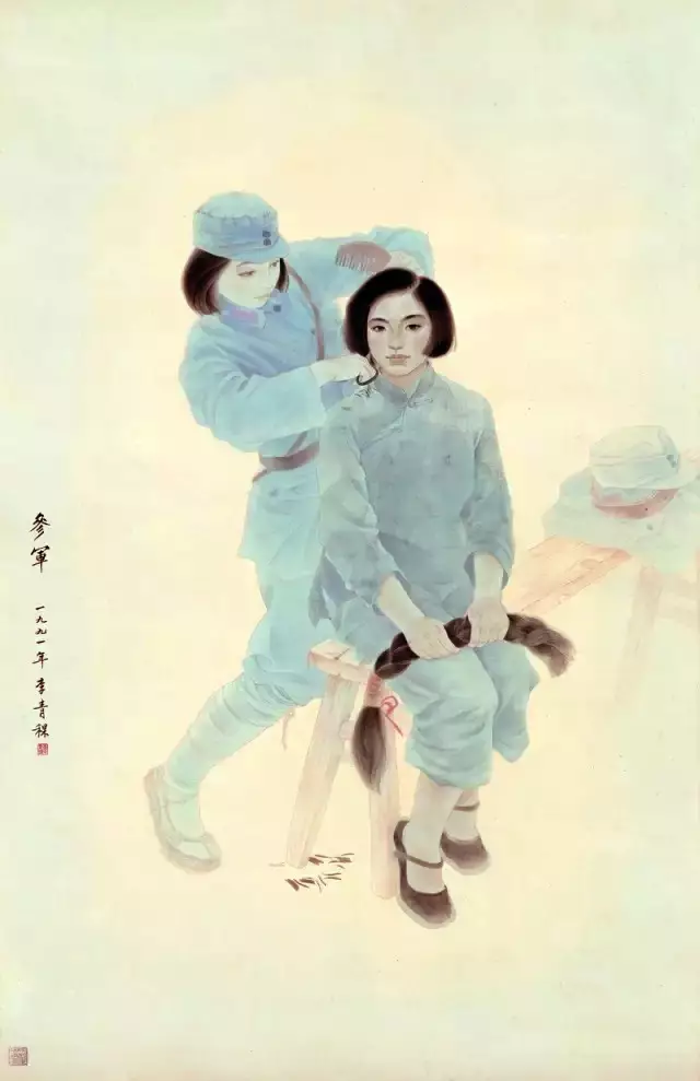 91年创作《参军》最大的困难是要走出文革时期的概念化图像阴影。我刚从学校毕业不久,急于想将所学的美学观念、技巧、技术运用到创作中去。突破概念化唯一的办法就是到生活中寻找真实的形象,将《参军》中的两个不同身份的妇女角色,通过形象表现出来。我来到武警文工团,找来几个年龄相仿的女战士为模特,拍照、写生。没有经历过战火年代的女战士,满脸洋溢着幸福的笑脸,不见当年女八路军战士的飒爽英姿。这使我感到创作起来十分的困难。特别是那位正襟危坐的妇女,她那坚定的目光,既不能有表演的痕迹瞪着眼看观众,也不宜有女性温柔似水的表情。分寸与尺度是我着重把握的重点,肢体语言的外化和面部表情的刻画是我的抓手。一方面要把被剪辫子的姑娘,表现得端庄、坚毅、而又不能流露出半点人为摆动出来的样子,又要区别身后的八路军女战士那种受过革命洗礼的新青年的形象。