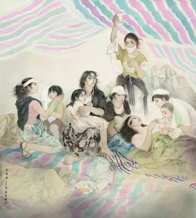 在技法处理方面,我努力将传统的工笔画技巧,运用到现实题材中去,从素描转换成线描。由西画体面关系,转换成耐看的平面肖像。这种观念的转换所带来的技术跟进,在当时虽然已经有不少前辈进行了探索,但具体实践起来还是受素描观念的约束,困难很大。线与面究竟是什么关系,如果不画结构,势必容易落入俗套成为“月份牌”绘画。巧妙地运用逆光,帮我找到一种解决画面既平面却又可以深入刻画的方法。八路军女战士在逆光下反射出透亮的脸,加上身体优美的姿态与线条,女战士形象鲜活地跃然画上。女战士的模特是我的一位画家朋友,她的脸上有一种自信、纯洁、善良的气质,正好适合我心目中的八路军女战士的形象,她与坐着的妇女脸上反光减弱,一强一弱对比,帮助我找到解决素描与线描之间矛盾的方法。同时也充分发挥线条的独立作用。