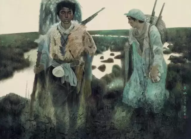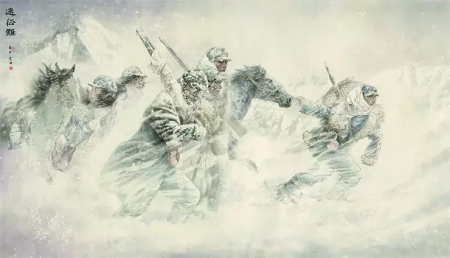 在艺术处理上,为了深入刻画形象,保留中国画以线造型的特点又不失结构的特征,光的巧妙运用又一次为我解决了难题。微弱的火光,正好打在女孩的脸部,根据光沿线的深浅,女孩的脸部由亮变暗,鼻子、眉弓微微发亮,眼睛甚至保留了一块白色的亮点,以突出专注而静穆的表情。画面的亮光从红军女战士手捧着的微弱的火光中散发,向周围蔓延。画面由亮转向灰暗,突出了红军女战士冻僵的手、马灯和人物形象。在《西风烈》的创作中,为了作品整体的氛围营造,我放弃琐碎的细节刻画,在这幅作品中,放弃与主题无关的细节是这幅作品最后获得成功的重要因素。作品在简练中呈现丰富的内容,以达到艺术的境界,简练而不单薄是我对这幅作品的基本诉求。