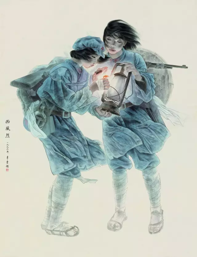上述构思激起我强烈的绘画冲动,也为我创作《西风烈》奠定了很好的基础。在绘制《西风烈》的过程中,我尝试将工笔画的写意精神运用到创作中去。《西风烈》的情节具备了写意性要素。黑夜中的马灯,可以大虚大实,凛冽的寒风构成静与动的对比;剪裁得不合身的军装,在风中形成大量倾斜的线条和两人体主轴形成的三角支撑,形成的画面外动而内稳,外乱而内静;这些都构成了《西风烈》的画面内容和特征,表达了我希望表现的绘画意境。在线条的处理上,我借鉴了永乐宫壁画的长条线描,起承转折力透纸背。头发的线条和衣纹的线条上下呼应,故意让女红军的身体微微倾斜打破稳定的重心,让画面整体处在运动回旋之中。工和写本来是一对矛盾,工笔画的写意性,是在对立统一之中求出路。南齐谢赫在《画论》中将“气韵生动”放在六法之首,这表示画面应该具备整体氛围和流畅地表达,如行云流水般自然。“气韵生动”在六法之首说明气韵生动是中国画画面整体艺术效果的要旨。