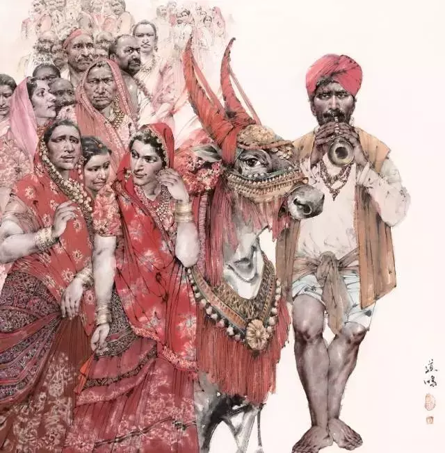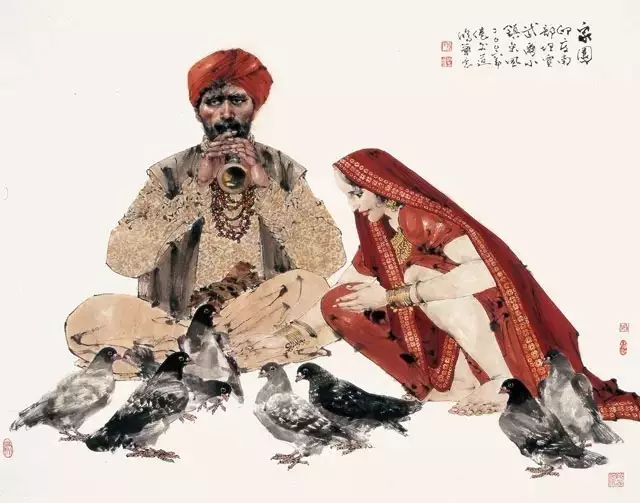 我的画分古今题材两部分。古代题材偏重于传统,现代题材合成中西。前者尚有汉唐重彩之痕,走线运笔且存宋元至任伯年之迹。后者亦具油画之嫌,魏列夏庚、克里木诗、德拉克罗瓦、巴巴之留印皆可窄见。许数载之后,痕迹虚然,幻化与我,或可真正称得上创造风格。