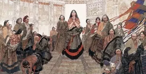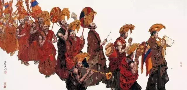 看见太阳照射下通体辉煌的色拉寺;亲瞻青海安多的神山圣湖和终年苦恋与珠穆朗玛峰永恒不化的积雪;目睹若尔盖大草原汹涌翻卷的朝圣人潮;面对康巴汉子强悍的目光与风雪撕咬的老羊皮袄;胸膛是野性和爱的草原,中国画的笔墨当何以演释?