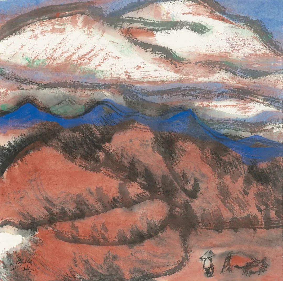 这里真是充满神奇色彩的“牧歌”画卷。每次散步归来,唯恐这种感觉消失,我抓起案头的颓笔,用宿墨、矿物颜料,疾速地在小幅纸片上纵笔涂抹。这也许才算写生吧。不直面景物,而是将所看之景、所想之情一起抒发出来。“景”或“境”通过笔墨、色彩直抒胸臆。我没有想过要画成国画或西洋画、工笔或写意。我只想在纸上留下看景时的心情,图个痛快。这样作画的过程中往往有意外之笔的惊喜,让我乐此不疲。